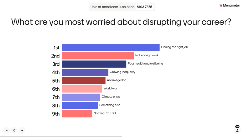 Most focused on individual issues relating to their own career, but there was also considerable concern about what kind of world they were living in with concerns about inequality, AI and world war being raised. Last year war dominated these contextual concerns and relatively few people raised inequality. I continue to be surprised about how unconcerned people seem about climate change, which seems to me to be the biggest and most certain threat.